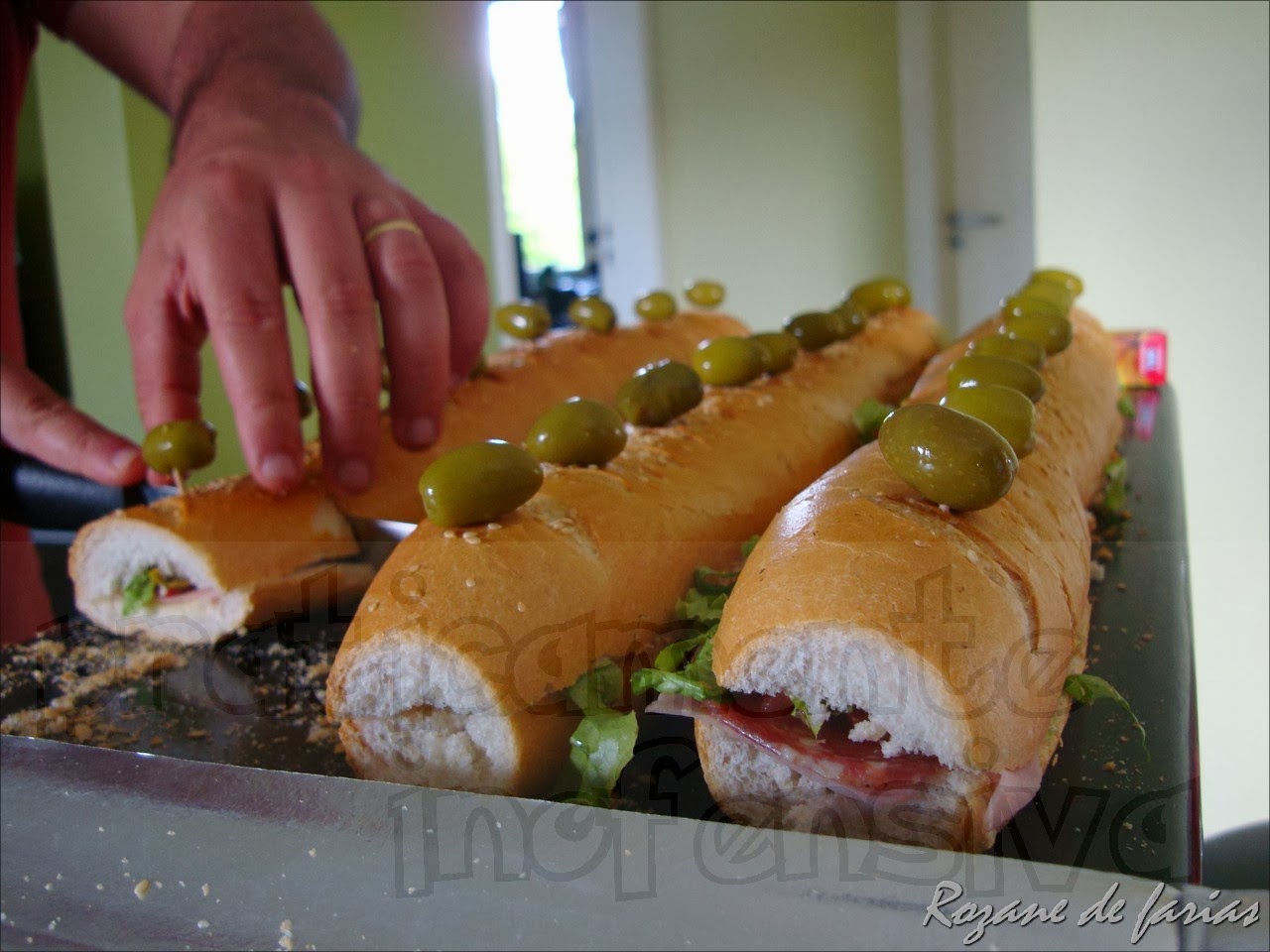 Olá pessoal!!Vim compartilhar com vocês o que preparei para a minha festa de aniversário. Nesse ano, resolvi que iria ter um aniversário mais saudável, por isso decidi descartar as  frituras!! Fiquei num dilema porque também não queria ter muito trabalho e estar acabada durante a festa. Pesquisei o poderia fazer e não ficar com cara de festinha infantil, e descobri os incríveis sanduíches saudáveis e deliciosos! Primeira ideia era fazer bombons de sanduíches, mas percebi que não seria nada prático, e por sugestão do meu marido decidi fazer o sanduíche em metro. Foi prático, rápido e meus amigos e familiares adoraram!!! Meu marido colocou a mão na massa e me ajudou. Montamos catorze baguetes com quatro tipos de recheio, e cada uma rendeu 9 pedaços. Levamos duas horas para fazer.