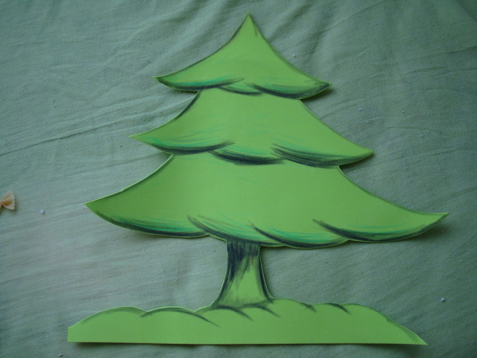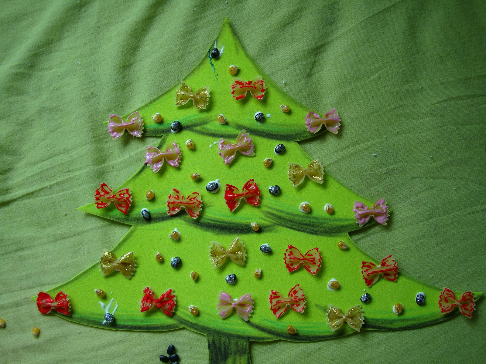 Estamos decorando a escola para a festa de Natal que será no dia 12 de dezembro. Cada professora ficou encarregada de fazer um enfeite para a porta da sala. Todas já colocaram, mas eu com a minha colega da manhã ainda não. Ontem dei uma de Tinkerbell, a fadinha artesã, e em uma hora confeccionei um pinheirinho, que por sinal ficou bem lindinho. Materiais que usei: Eva,cola,cola colorida, milho, feijão e macarrão. Eu não tinha material, então busquei na cozinha algo que desse pra usar.