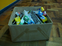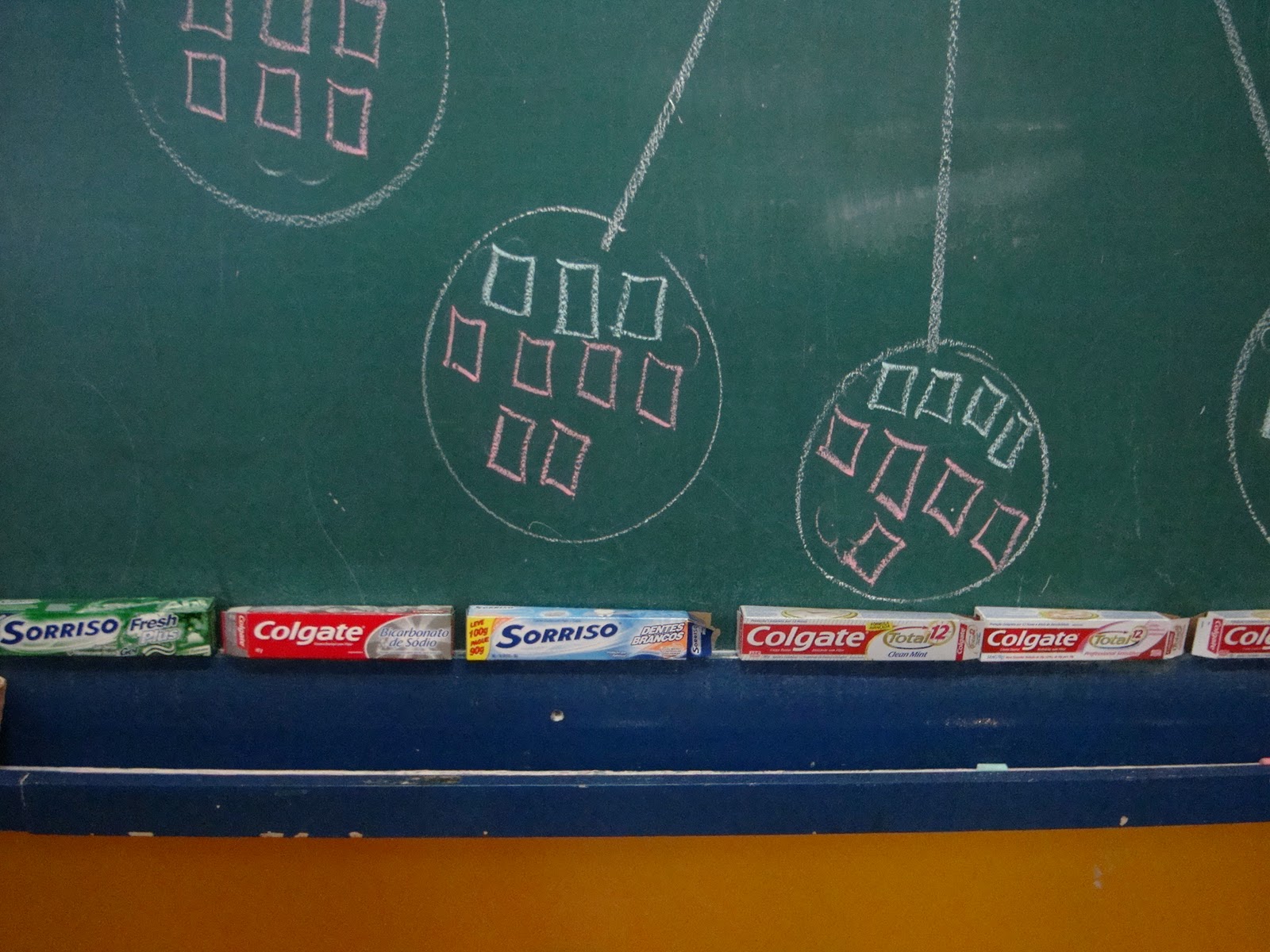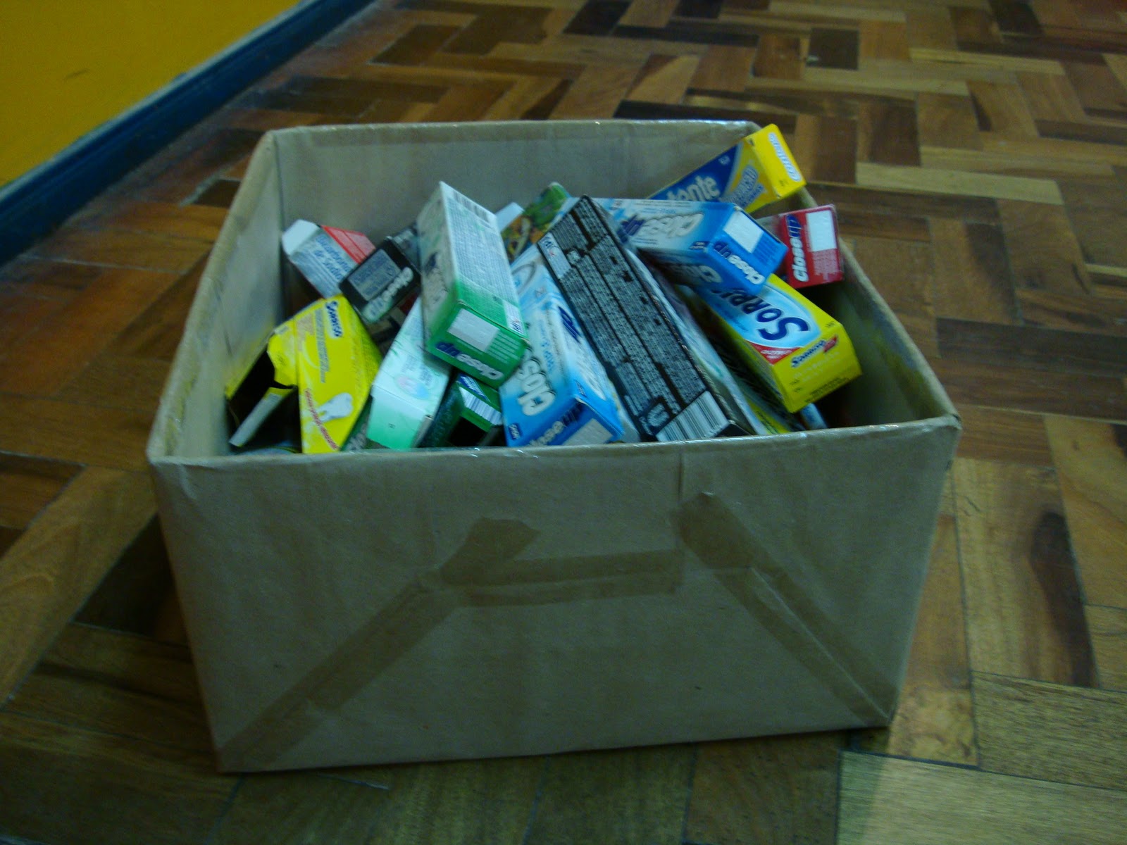 Havia pego a caixa maior, que estava as caixas de pasta de dente para distribuir. Coloquei todas elas no aparador do quadro e os alunos comentaram: