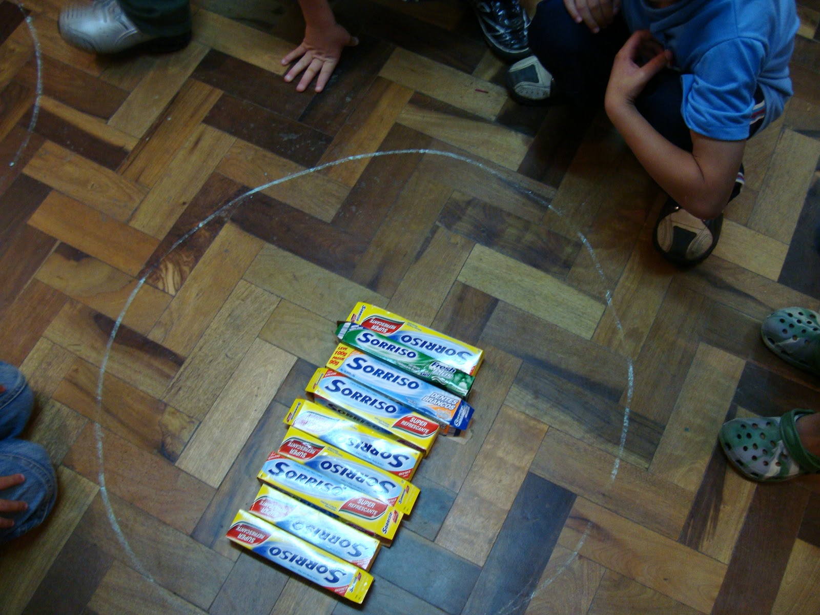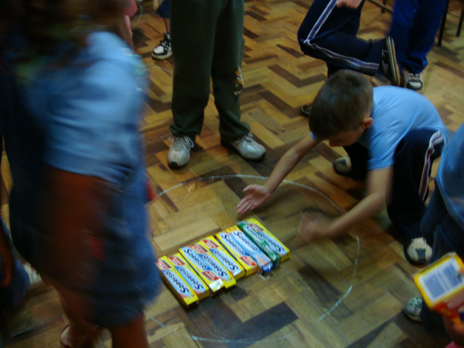 Os alunos escolheram que deveria ser por nome das marcas.E separaram colocando dentro dos círculos que desenhei no chão.
