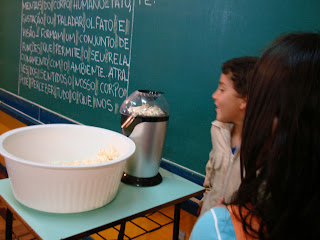 Perguntar para os alunos quem tem uma pipoqueira elétrica em casa. Estourar pipocas  na pipoqueira elétrica .