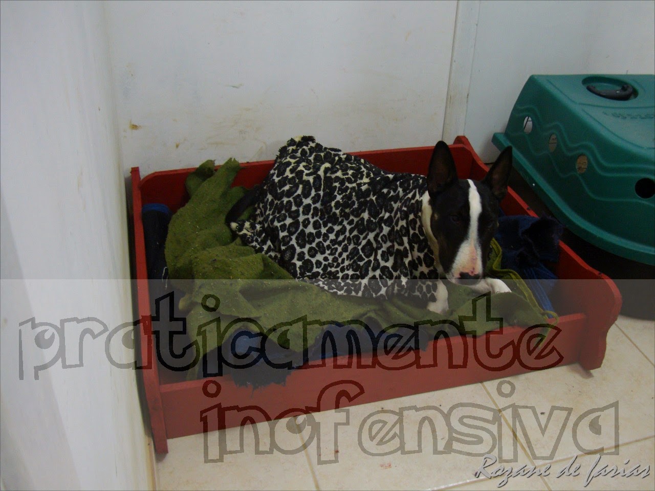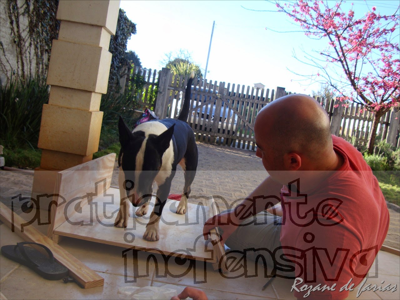 animal em cima de plataforma vermelha de rodinha e mais atrás, poste de